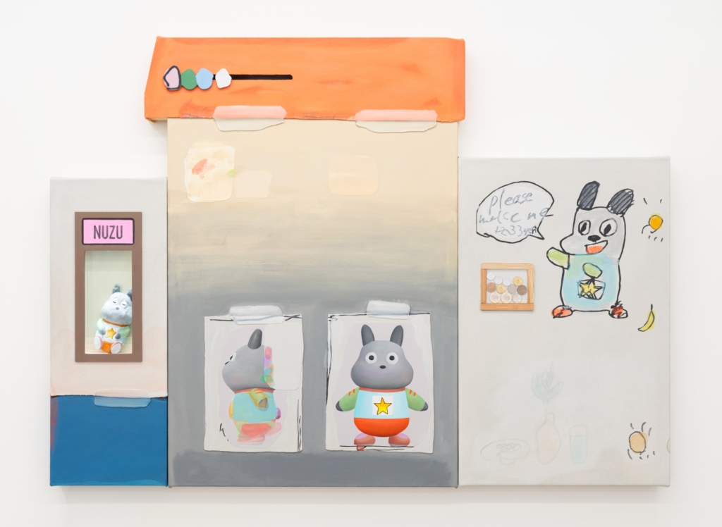 Underlying this method is Takahashi’s long-standing interest in animistic ways of thinking. Grounded in the belief that all things in nature possess spirit or intention, he grants life to objects conventionally regarded as inanimate—such as toys and stuffed animals—speaking to them and forming relationships with them. These interactions are characterized less by faith or ritual than by a lightness akin to play. Through the accumulation of dialogue and communication between the artist and his motifs, a distinct worldview gradually takes shape and reemerges as painting. At the same time, traces of this communication are visualized through naïve, seemingly childlike drawings reminiscent of doodles, functioning much like automatist drawing in Surrealism and reinforcing an animistic sense of vitality.